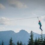 TYROLKA - zastrzyk adrenaliny podczas 350-metrowego zjazdu z platformy zawieszonej 9 metrów nad ziemią na szczycie Gubałówki, dzięki czemu gwarantujemy piękne widoki na panoramę Tatr.